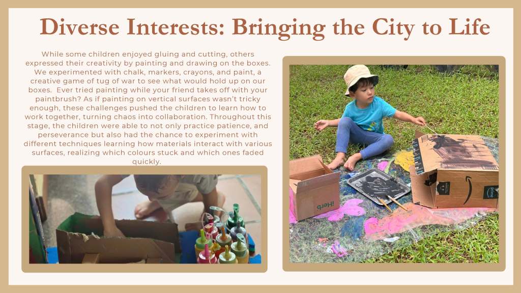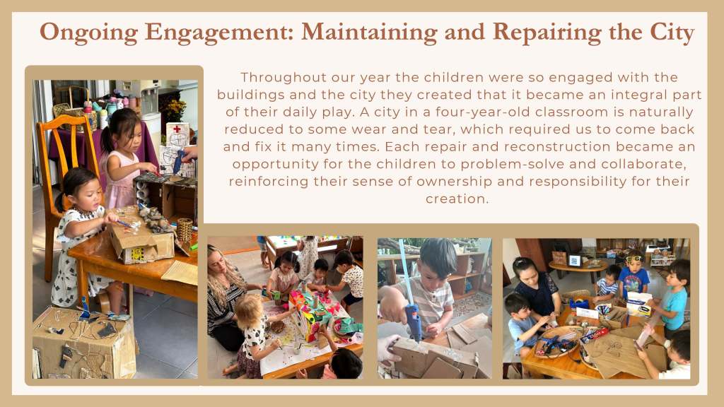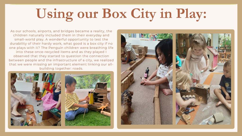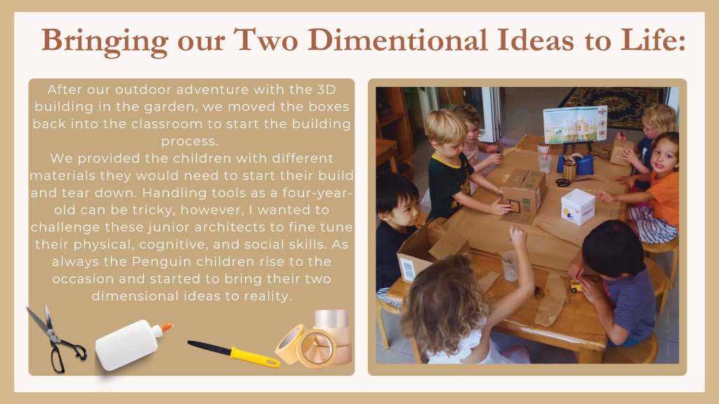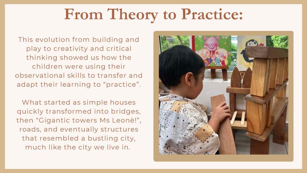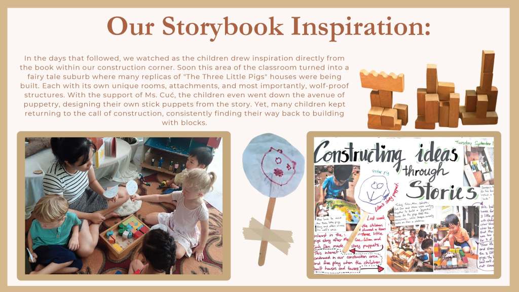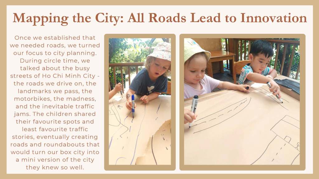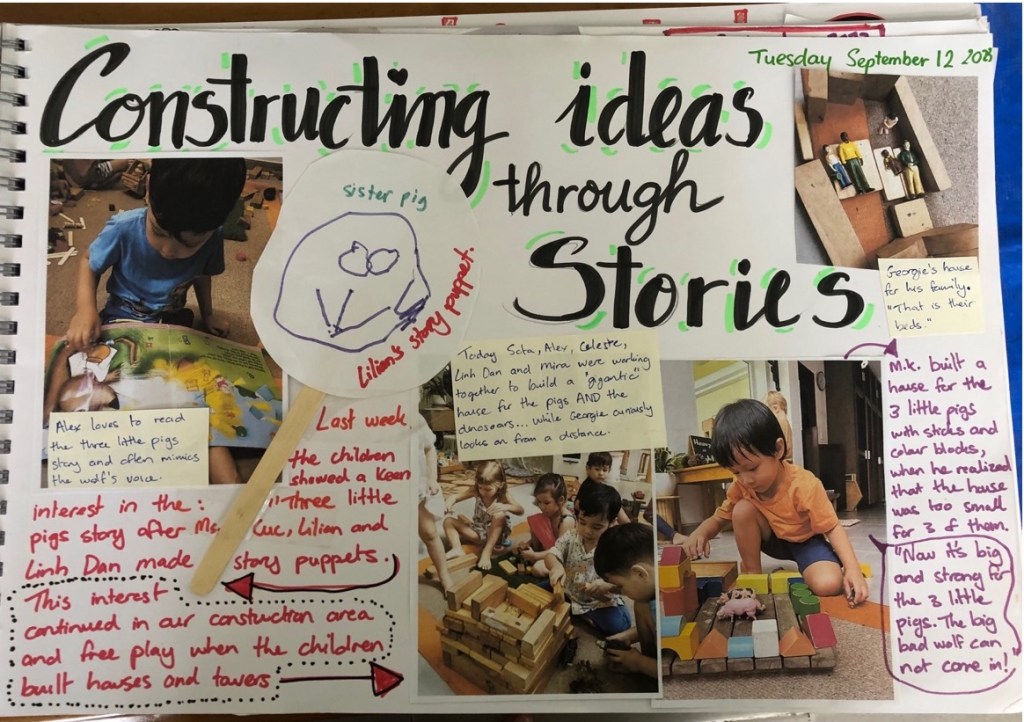 Leonè and I had some wonderful conversations as she introduced me to the children’s interest in buildings and construction and the very beginning of a possible project of inquiry focused on the city of Ho Chi Minh City (Saigon, Vietnam). This was a perfect opportunity to put our training into practice and test out the use of the floorbook to document children’s interests and to embark on a project of inquiry. This curriculum approach created powerful thinking and planning connections for the children; and for the teaching team in the Penguin class, Leonè, Ms Cúc and Ms. Linh, and amongst the families as well.
