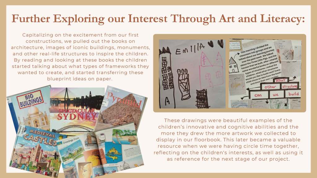 I had introduced the Floorbook Approach (see resource recommendations at the end of this blog) as a way for staff and children to collaboratively document, reflect and plan an inquiry-based project that spanned across the curriculum for a whole year. The children’s interest in the “Three Little Pigs” story sparked interest in building and dwellings, as illustrated in a floorbook page from early in the children’s year in the Penguin room (see image below).