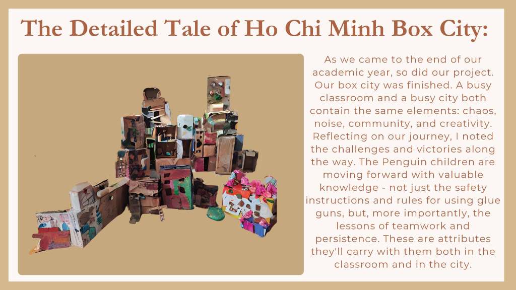 This blog shares the documentation about the Tale of Ho Chi Minh City project which was completed across the whole school year by Leonè (in partnership with co-teachers Cúc and Linh, and the children). I would especially like to thank the Penguin class children for their amazing work across a whole school year and thank their families for agreeing for their work to be published in this blog. Additionally, I would like to thank the whole Saigon Kids team, along with Jo Mitchell and Ms Kieu An, for inviting me to be part of the professional learning journey in your child-honouring, amazing early learning service.