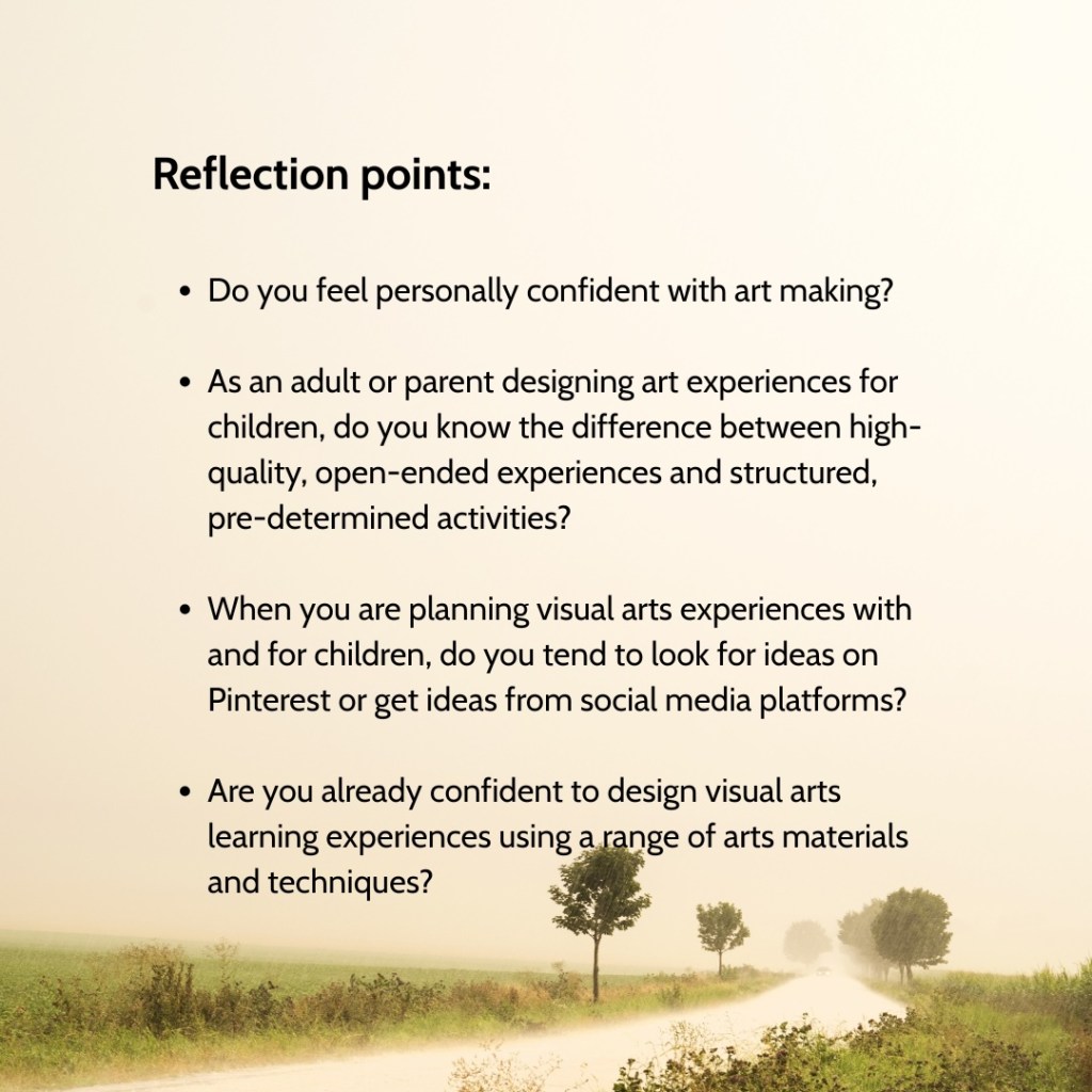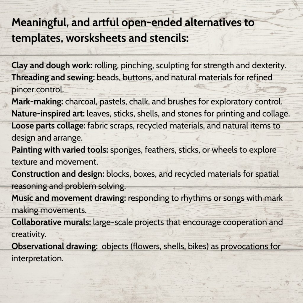Templates, stencils and worksheets potentially impose adult‑determined outcomes, replacing exploration with compliance and reducing dialogue to direction. When every child’s work looks the same, individuality disappears. When expected to comply with such close-ended tasks, children can internalise a message that their ideas are inadequate unless they fit a prescribed shape, performance or outcome. In comparison, authentic arts practice invites children to design, interpret, and experiment. There are just so many rich and varied ways to meaningfully support children’s learning in playful and child-responsive ways that there should be no reason to resort to adult imposed activities. For example, the following open‑ended, child‑led visual arts learning experience suggestions offer much more meaningful, open‑ended pathways for skills and knowledge development: