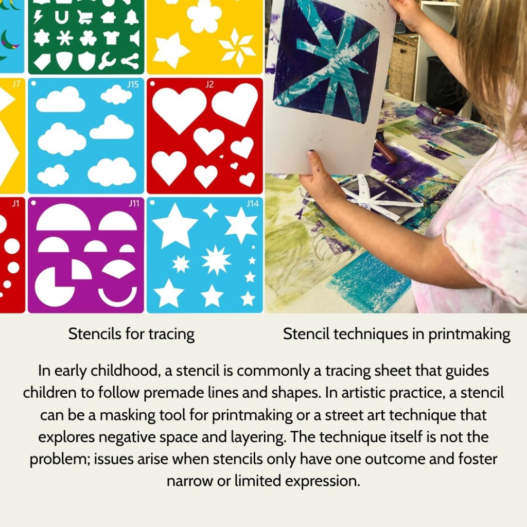 Explaining the artistic use of stencils and templates may need to be unpacked in a future blog…But for now, it will suffice to consider the FULL definition of each of the term to appreciate the assumptions we make about how these terms are interpreted and used in different contexts. Think about how we could potentially frame these terms to align with open-ended arts processes rather than through adult-designed worksheets.